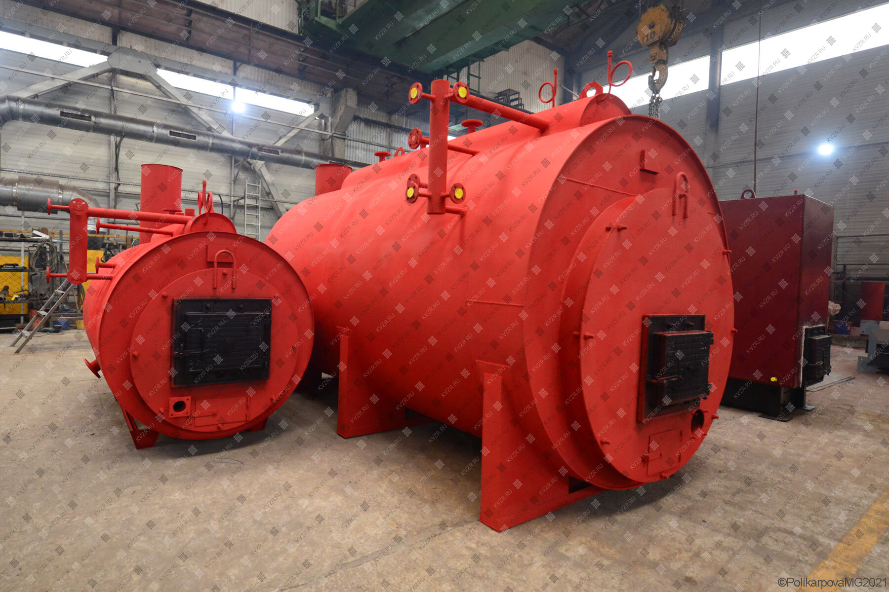 Стальные промышленные парогенераторы с низким давлением изготавливаются из двух цилиндров разного диаметра, вставленных один в другой и соединенных между собой фланцами и паросборником. В передней части котельного блока размещена топка, а в задней части - конвективный пакет труб, ввариваемых во внутренний цилиндр перпендикулярно друг другу. В задней части агрегата располагается постамент дымовой трубы с встроенным взрывным клапаном.
